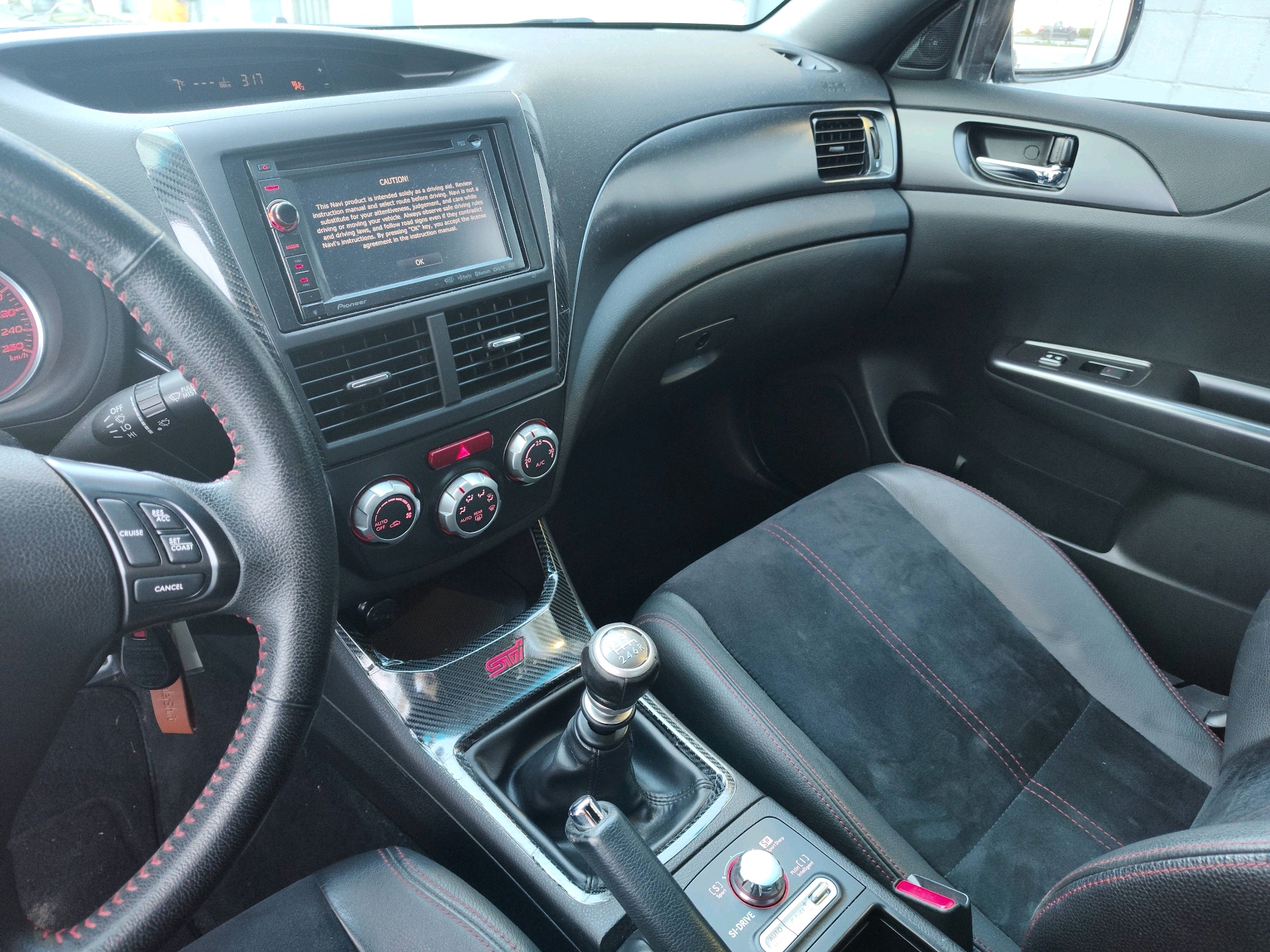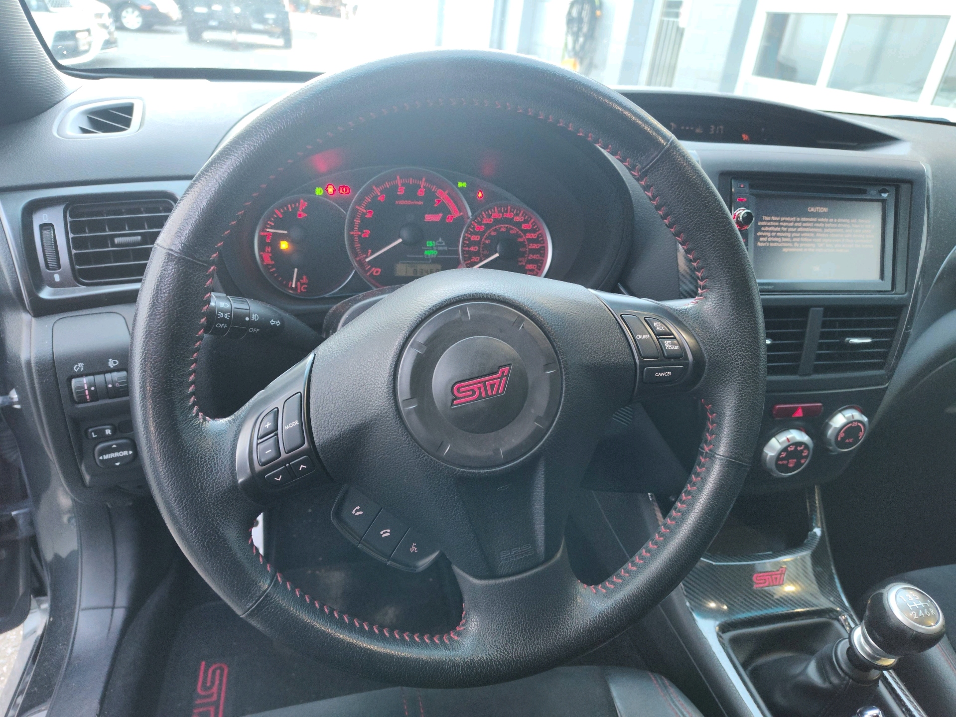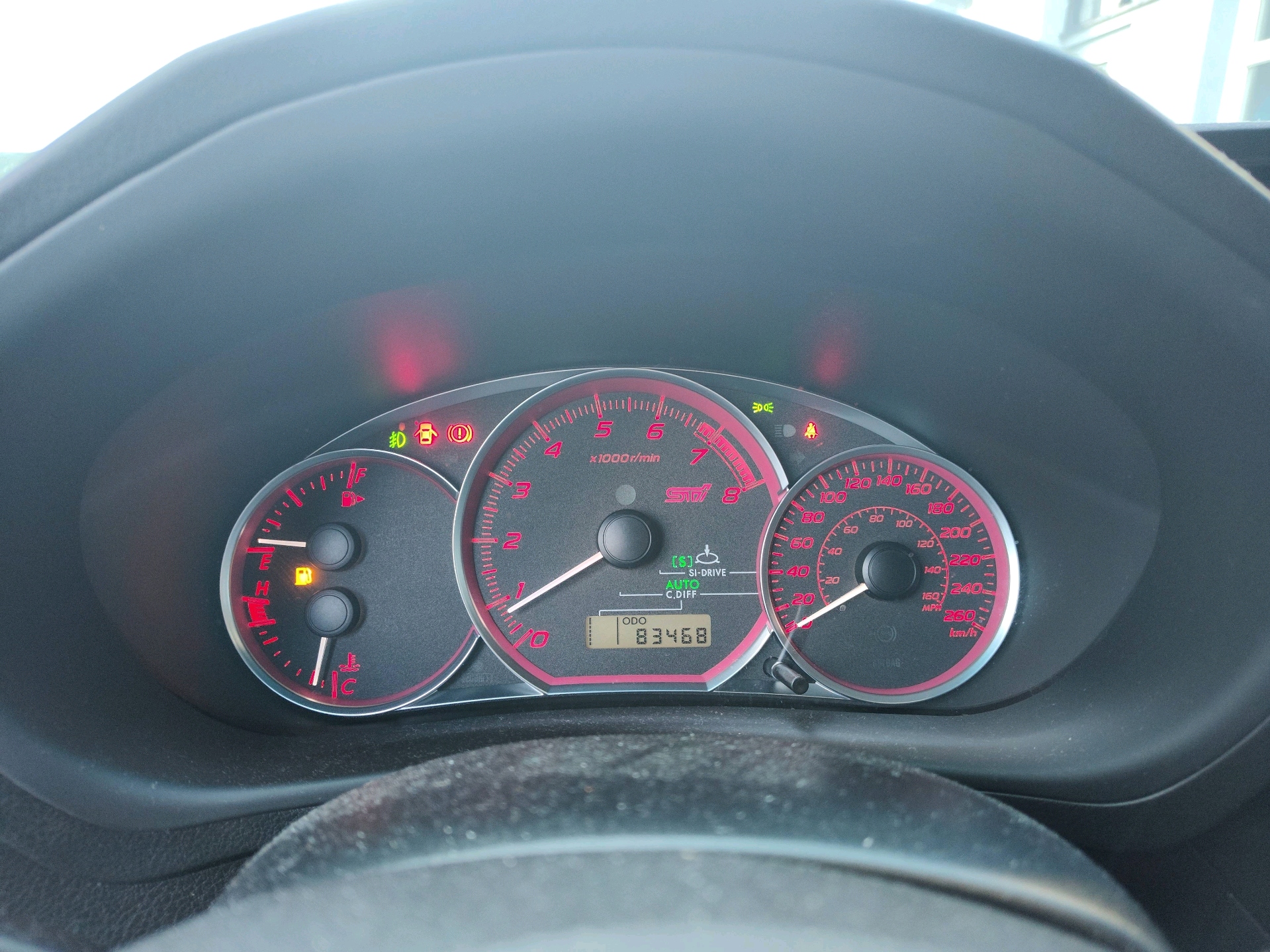 Instrument panel -inc: electroluminescent sport design gauges w/metal trim, adjustable dash illumination, full needle sweep on startup, speedometer, 8000 rpm centre mounted tachometer w/warning alarm, duel trip odometer, fuel gauge, fuel door indicator, fuel economy, ambient temp, coolant temp, multi-mode DCCD indicator, multi-mode vehicle dynamics control system indicator, SI-Drive mode indicator, trip computer